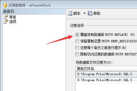 (1).原来数据库时还原选项构选“覆盖现有数据库”