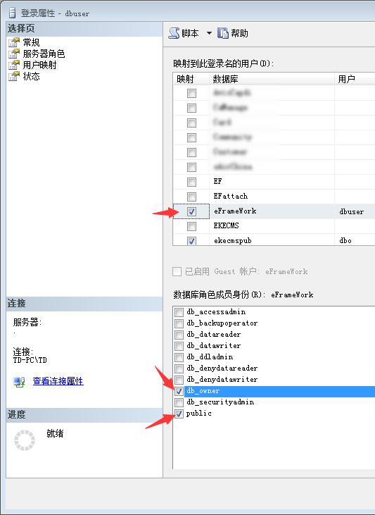 (2).推荐使用非sa用户,选择权限(public和db_owner)