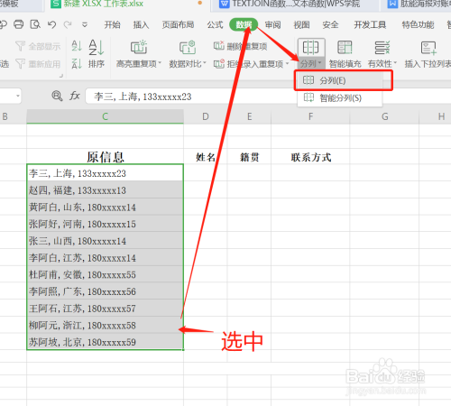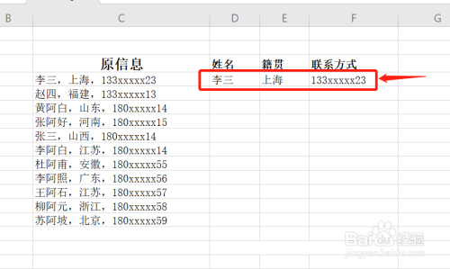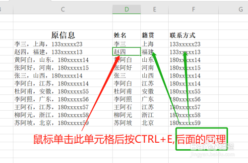 方法一(CTRL+E智能填充):将第一条的信息手动复制拆分成三列(打样),用鼠标选中第二条信息的拆分单元格,然后按CTEL+E自动填充第二条信息后的内容。