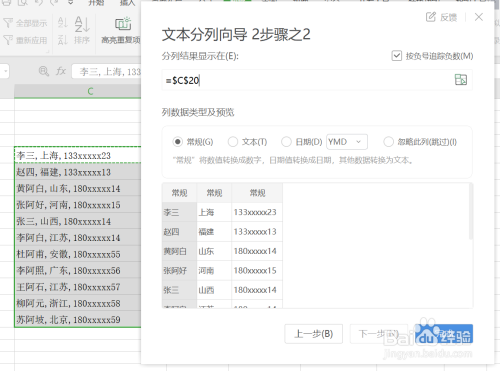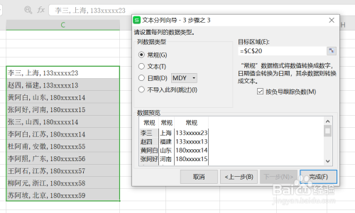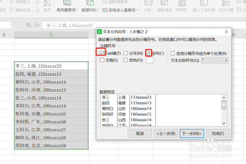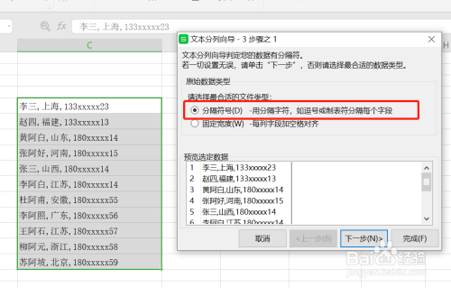 在弹窗中点击下一步选择相应选项(注意一定要选对分隔符),预览是否正确,点击完成。