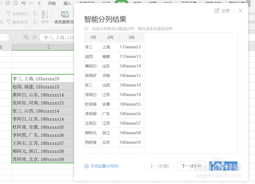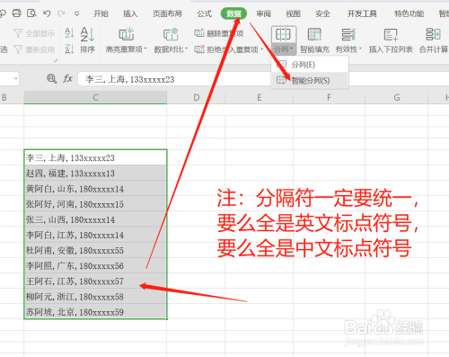 方法三(数据-智能分列):先中所有要拆分的内容,执行“数据-分列-智能分列”