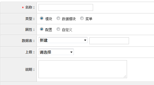 (2).类型 分为模块、数据模块、菜单三种,其中数据模块是为主模块回填数据用的,建立菜单项后,可以在菜单管理里面将模块放在菜单下。