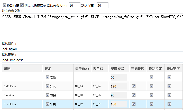 (1).显示 设置该字段在添加、修改、查看时是否显示。