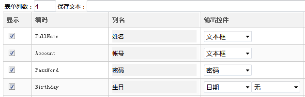 表单列数 添加、修改、查看时一行显示的列数。一个字段为2列,一列名称,一列内容。