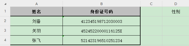 上面表格中,如何从身份证号码中快速提取到性别?操作如下