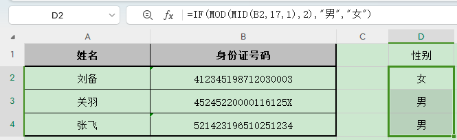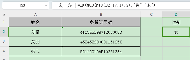 在D2单元格中输入=IF(MOD(MID(B2,17,1),2),"男","女"),性别就出来了。